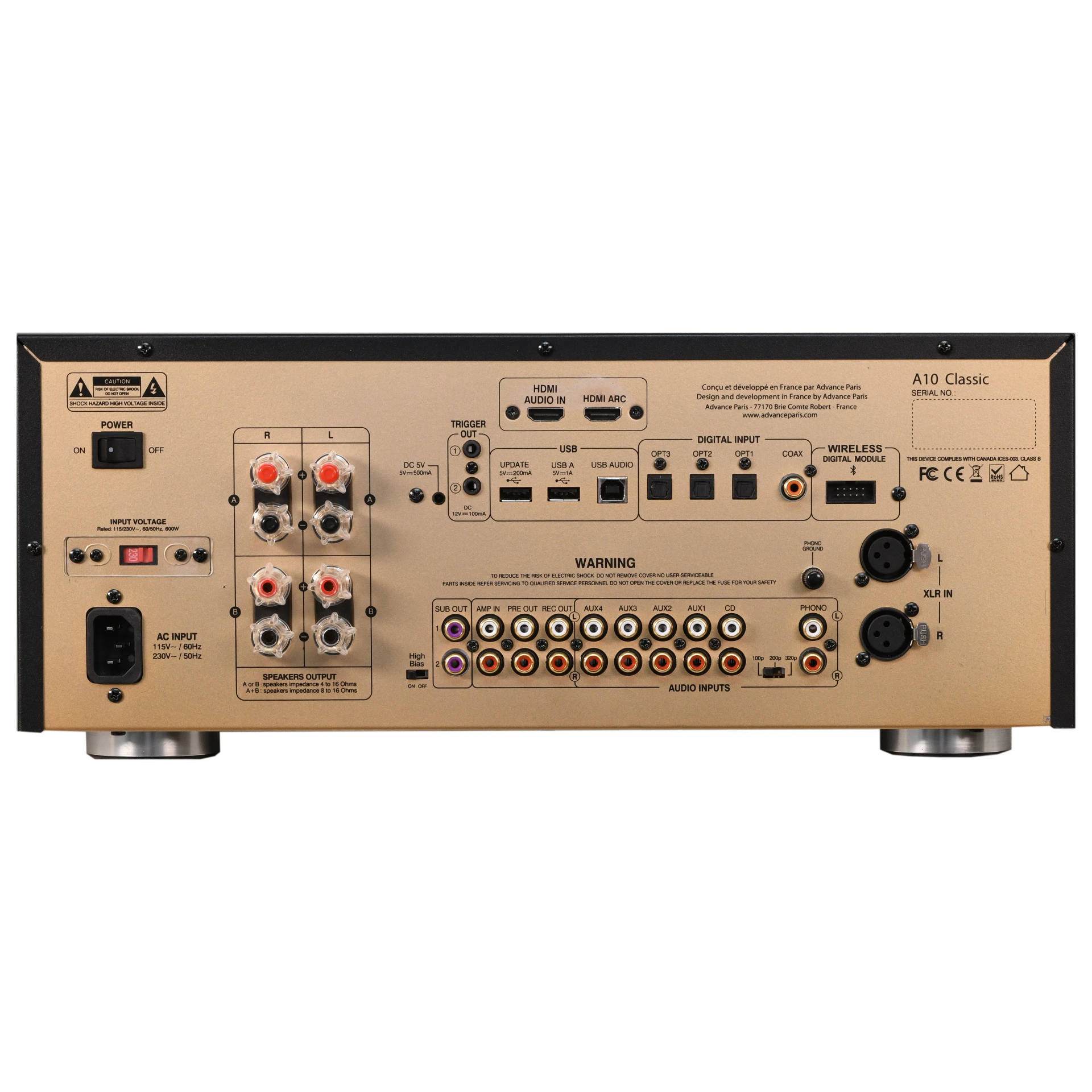 Equipped with a microprocessor to manage all functions via an encoder, the A10 offers seamless navigation through its menus. It supports a wide range of inputs, including six analogue inputs on RCA (with an MM phono stage offering three capacitance settings of 100, 200, and 320 pf), a balanced XLR input, and five digital inputs comprising three optical, one S/PDIF, and one USB audio. Additionally, it includes a connector for an optional aptX XFTB01 or XFTB02 Bluetooth receiver and a USB-A socket for playing MP3 audio files from portable devices or USB drives. Notably, two HDMI ports—one for DVD input and an HDMI ARC socket for CEC-compatible displays—enhance its versatility.